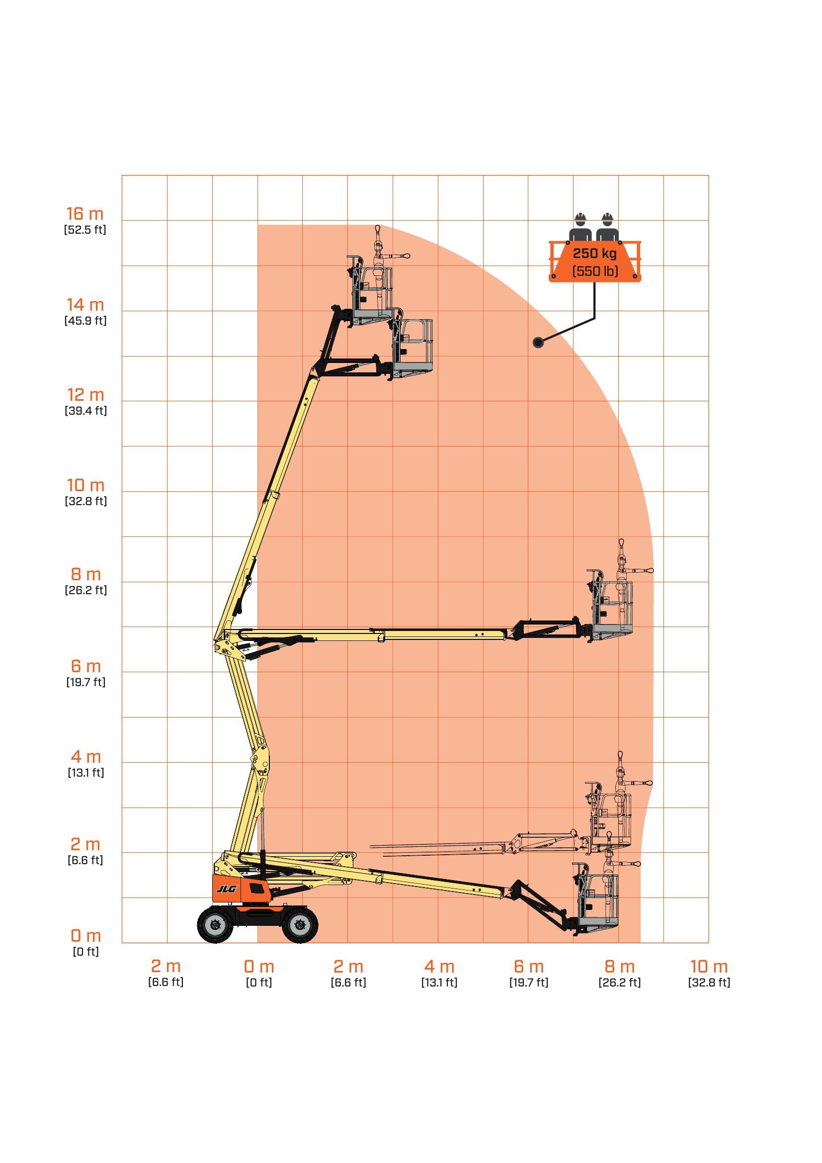 The JLG EC450AJ Compact Articulated boom lifts provides a working height of 15,9 m and a maximum of 8,9 m horizontal reach. The maximum lift capacity for this JLG is 250 kg.